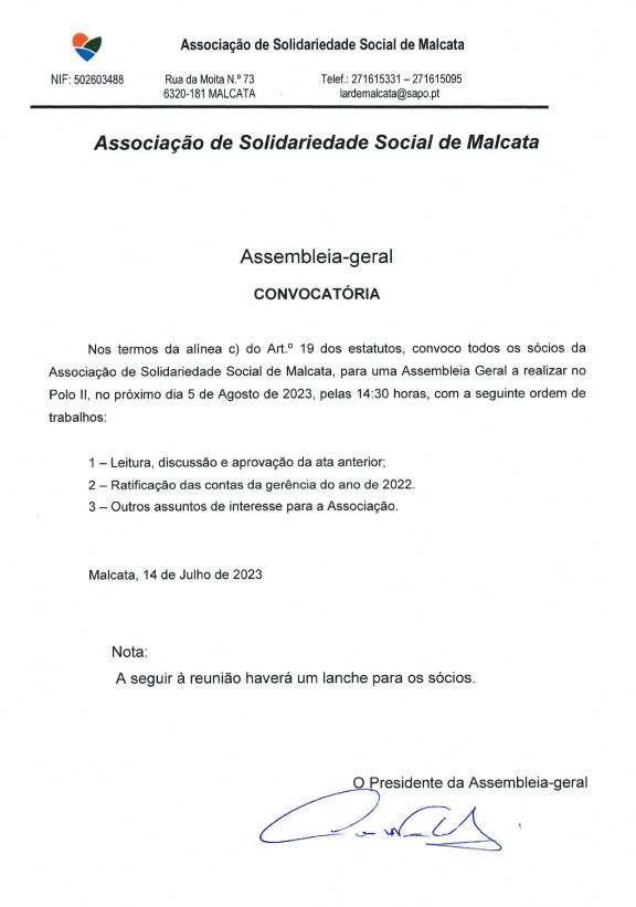 Convocatória para uma Assembleia Geral da Associação de Solidariedade Social de Malcata, no dia 05 de agosto de 2023 pelas 14h30, no Pólo II, com a seguinte ordem de trabalhos: