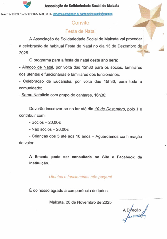 A Associação de Solidariedade Social de Malcata vai realizar a sua habitual Festa de Natal no próximo dia 13 de dezembro de 2025, reunindo sócios, utentes, familiares e a comunidade local em Malcata.
